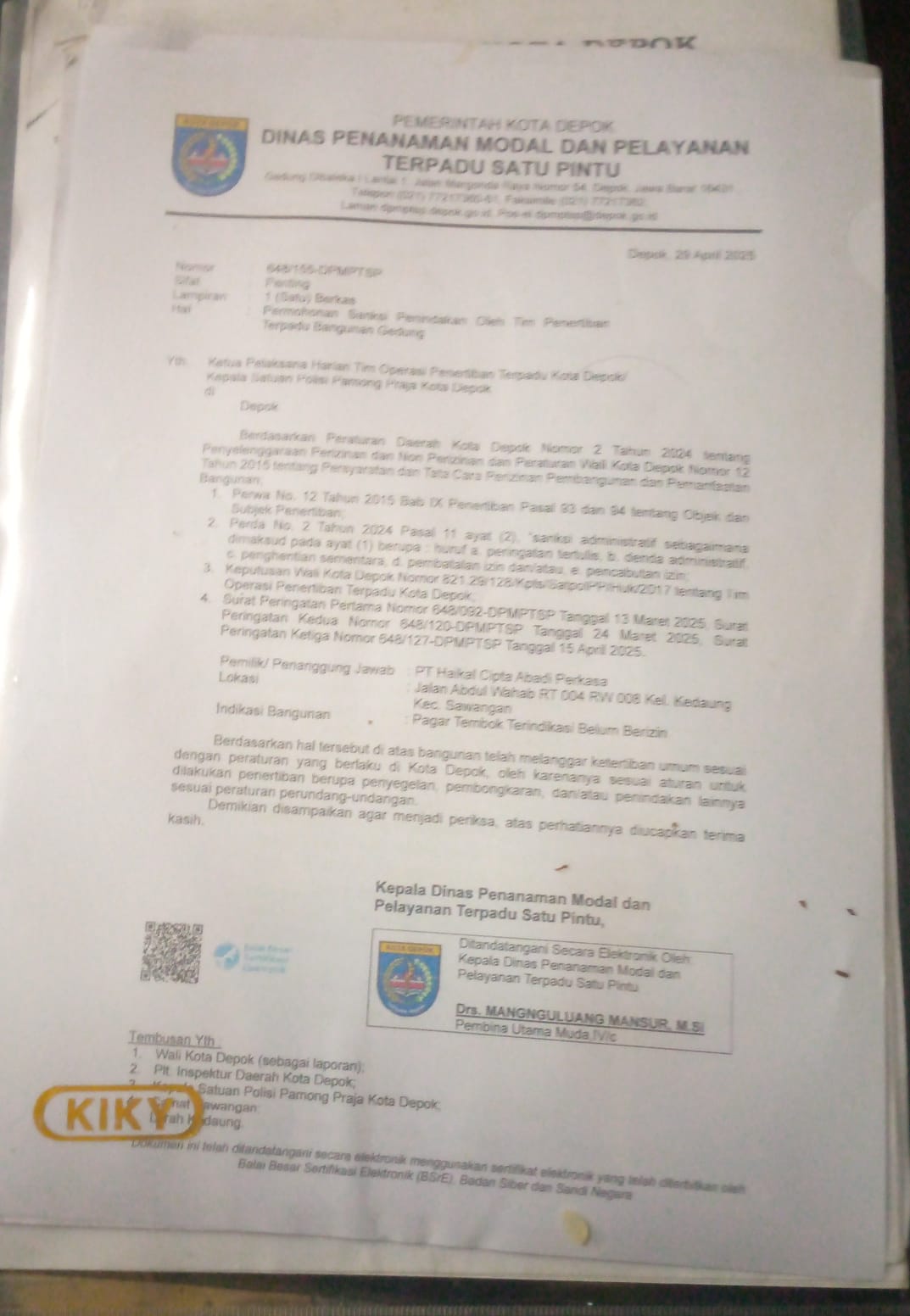 Wali Kota Depok No.821.29/128/Kpts/ Satpol – PP/Huk/2017 serta surat peringatan 1-2-3.No.648/127- DPMPTSP .15 April 2025