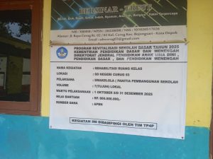 Depok – Tenarnestv9 Media Cyber Indonesia: Program Presiden Republik Indonesia (RI) Prabowo Subianto yang gelontorkan untuk bantuan rehabilitasi sekolah dasar Negeri dan Swasta dibiayai dari Anggaran Pendapatan dan Belanja Negara (APBN) tahun anggaran 2025 masuk dalam program prioritas Presiden RI untuk seluruh Indonesia, bawa angin segar dibidang pendidikan, namun digelontokannya anggaran itu kuat dugaan berpotensi disalah gunakan oleh oknum tertentu.